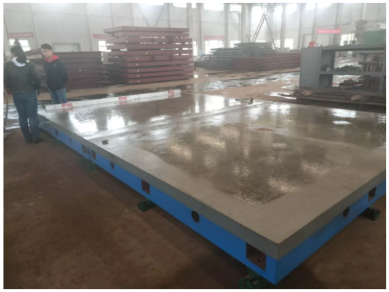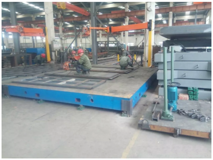 在人防门框和门扇钢框在制作流程中及双扇门在装配过程中,由于受到生产工艺、场地限制等原因,需要使用铸铁平台。一般使用的铸铁平台为4mX6m,如有特殊人防门型号,还需要定制不同大小的铸铁平台。