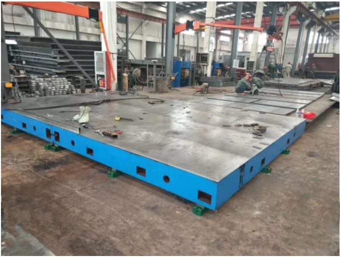 铆焊平台用于铆焊工艺的基础平板,工作面上有孔和T型槽,孔主要用来清理铆焊时的一些铁渣和焊接废弃物,T型槽主要是用来固定焊接件。