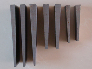 斜垫铁的规格以及精度要求:斜垫铁一般没有具体规格,一般是按设备重量设计图纸,定做加工。但常用的规格有100*50;120*60;120*80;150*80;160*80;200*100;200*120;200*150;240*120;300*150;等。斜垫铁精度一般为△12.5,为一般粗糙精度斜垫铁,△6.3为中级精度斜垫铁,△3.2为高级精度斜垫铁,△0.8为精密斜垫铁(磨床磨削平面而成)。斜垫铁在使用中安设备的精密度选择垫铁的精度。并非精度高的斜垫铁就适合所有设备。应该按实际需要合理选择斜垫铁。以达到使用斜垫铁的 初节约成本的目的。